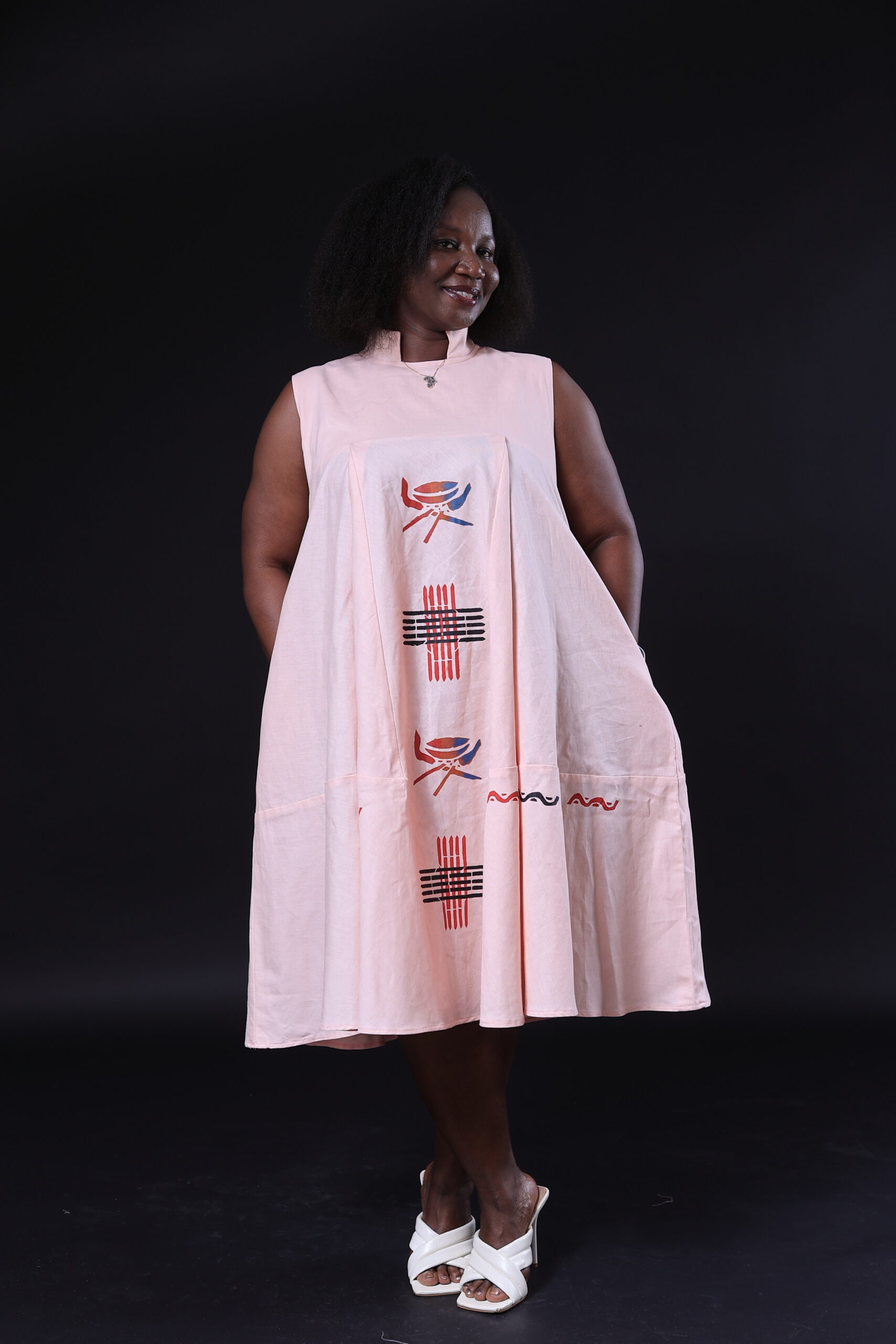 Robe courte évasée, col mao, dessin artistique sur bande centrale. Cette pièce est une véritable déclaration de style, fusionnant la rigueur d’une coupe structurée et la liberté de l’expression graphique. Le col mao apporte une touche de sophistication minimaliste, tandis que la coupe évasée offre un volume ludique et dynamique.
